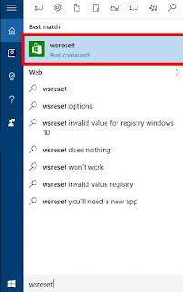 بۆ بەکارهێنانی لە گەڕان - کۆرتانا بنووسە wsreset و بیکەرەوە، بە کلیك کردن لە WSReset.exe پەنجەرەی فەرمانەکانت بۆ دەکرێتەوە و وا دەردەکەوێت کە هیچ ناکرێت بەڵام نیگەران مەبە و چاوەڕوان بە تا بەشێوەیەکی خۆیی دادەخرێتەوە و کۆگای ویندۆس دەکرێتەوە.